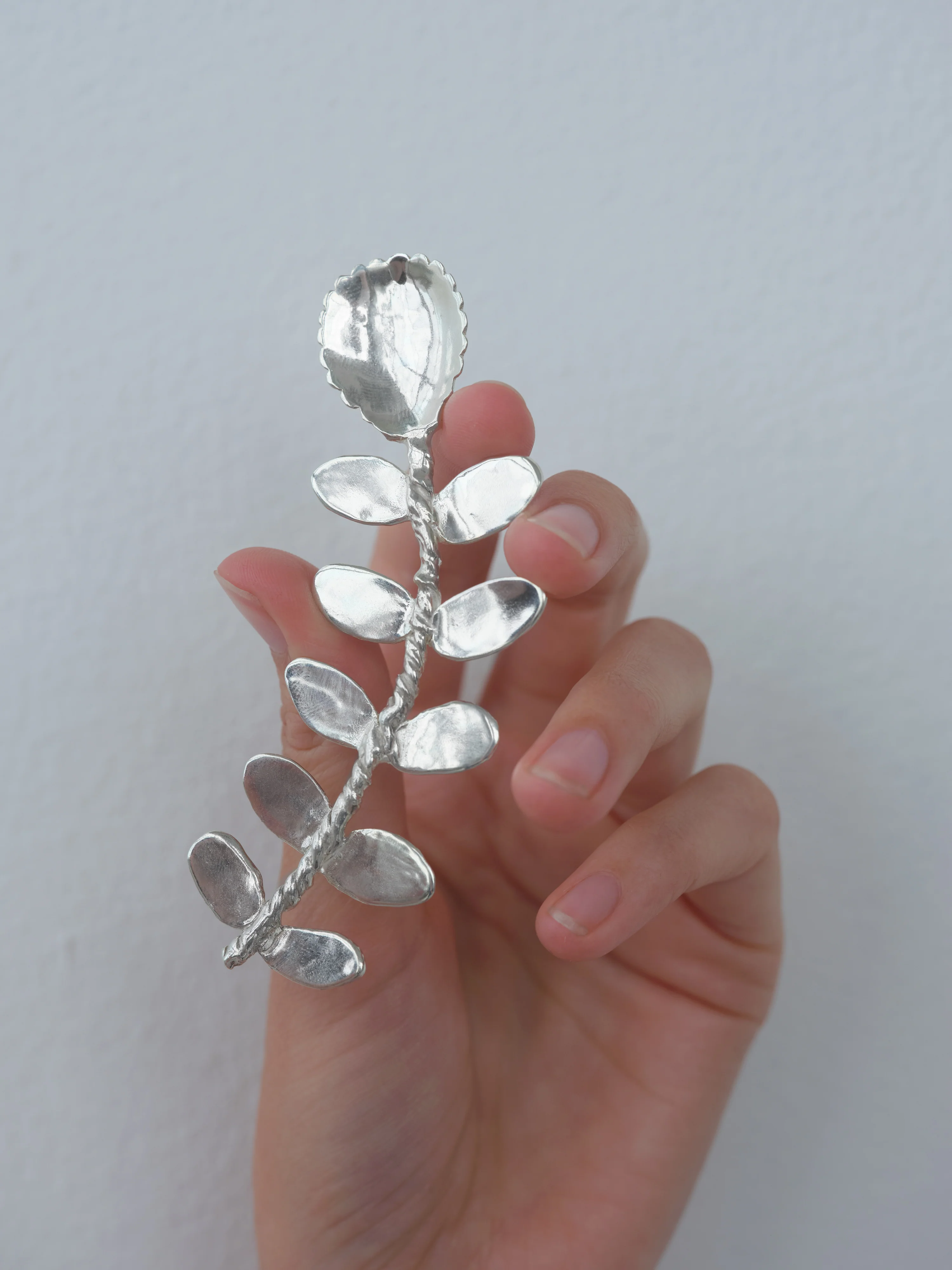 Compote spoon handmade in recycled sterling silver with leaves and a flower bud head