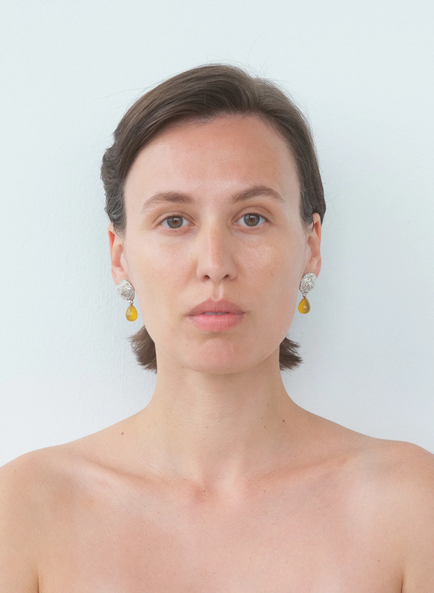 A pair of earrings handmade in recycled sterling silver shaped like rose buds with drop yellow agate stones