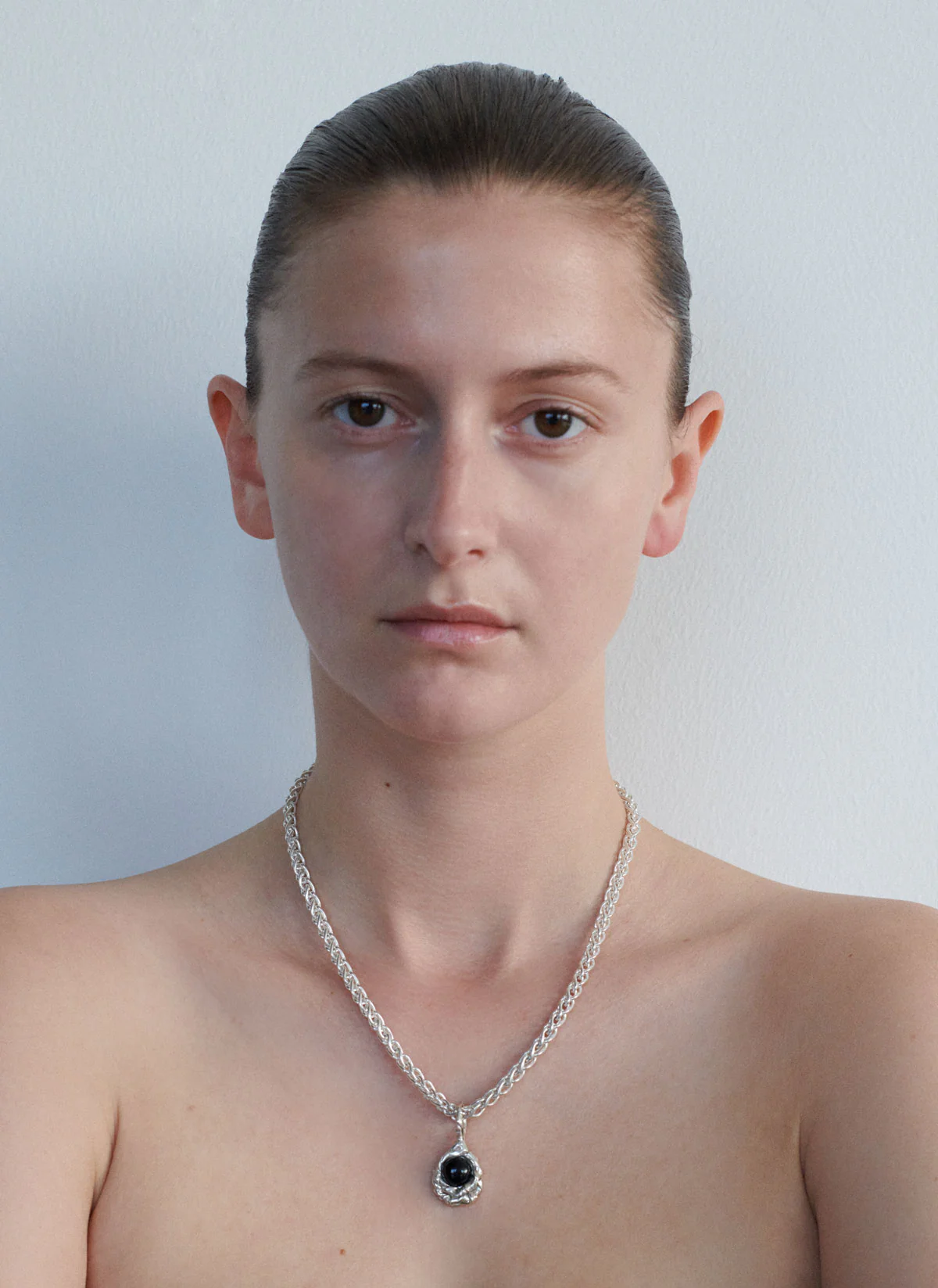 chain necklace handmade in recycled sterling silver assembled with a chestnut pendant adorned with an onyx stone
