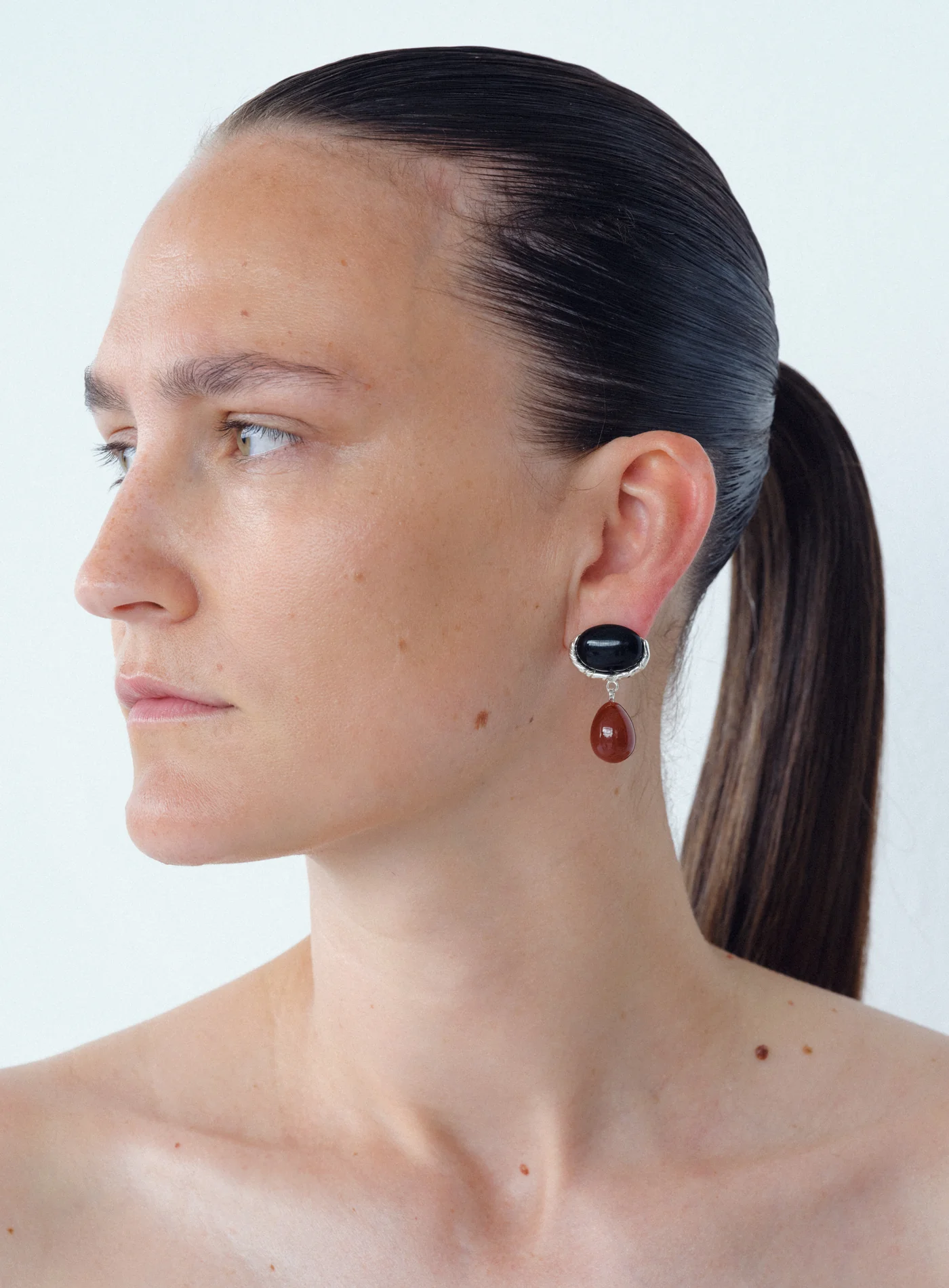 A pair of handmade earrings in recycled sterling silver with onyx and carnelian stones