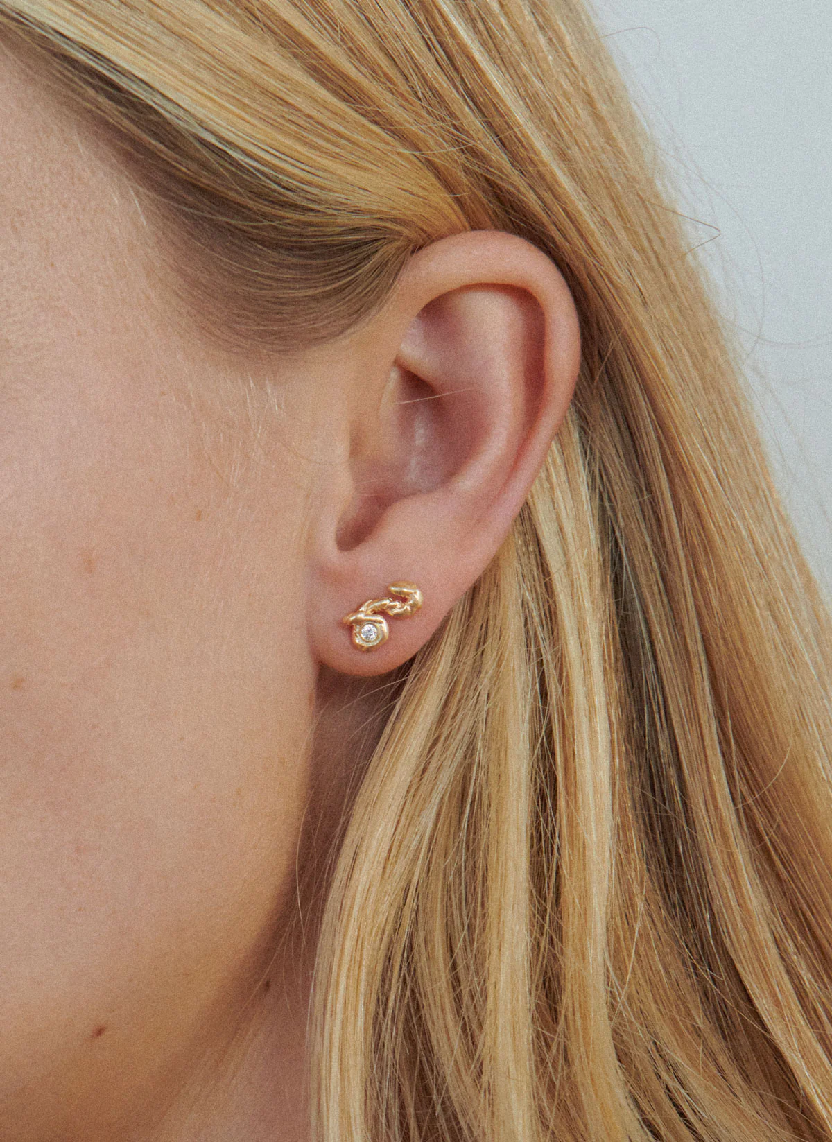 earring handmade in recycled 14k yellow gold shaped like a small ivy branch adorned with a 0.03 ct. top wesselton vvs diamond