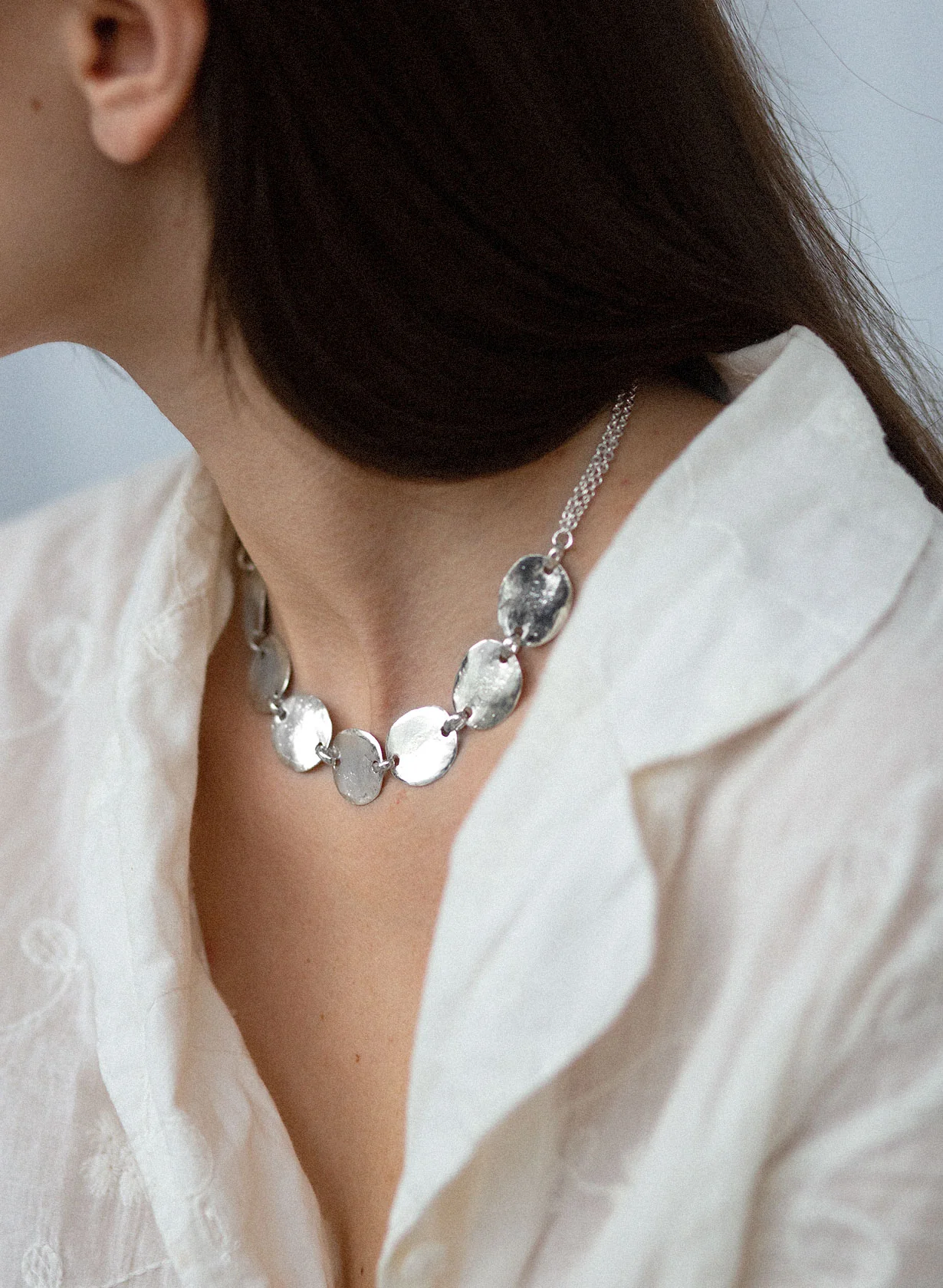 chain necklace handmade in recycled sterling silver with seven flattened coins
