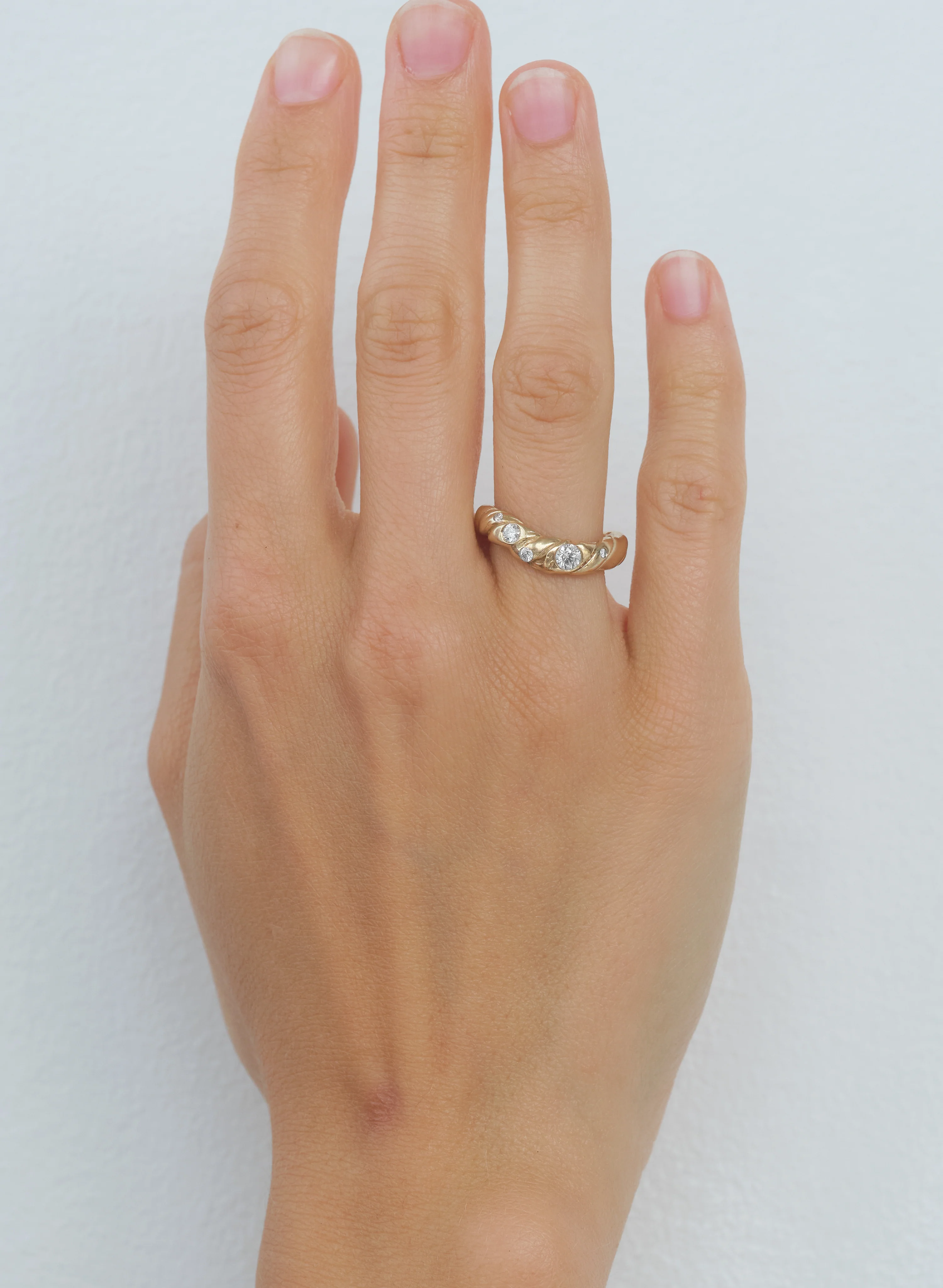 twisted ring handmade in recycled 14k yellow gold with five top wesselton vvs diamonds with a combined weight of 0.35 ct.